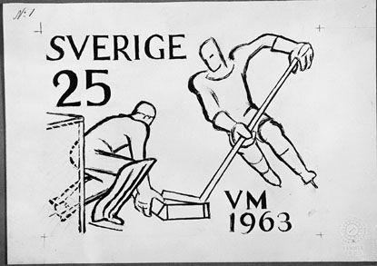 Frimärksförlaga till frimärket VM i ishockey, utgivet 15/2 1963. 1963 års VM i ishockey spelades i Stockholm.
