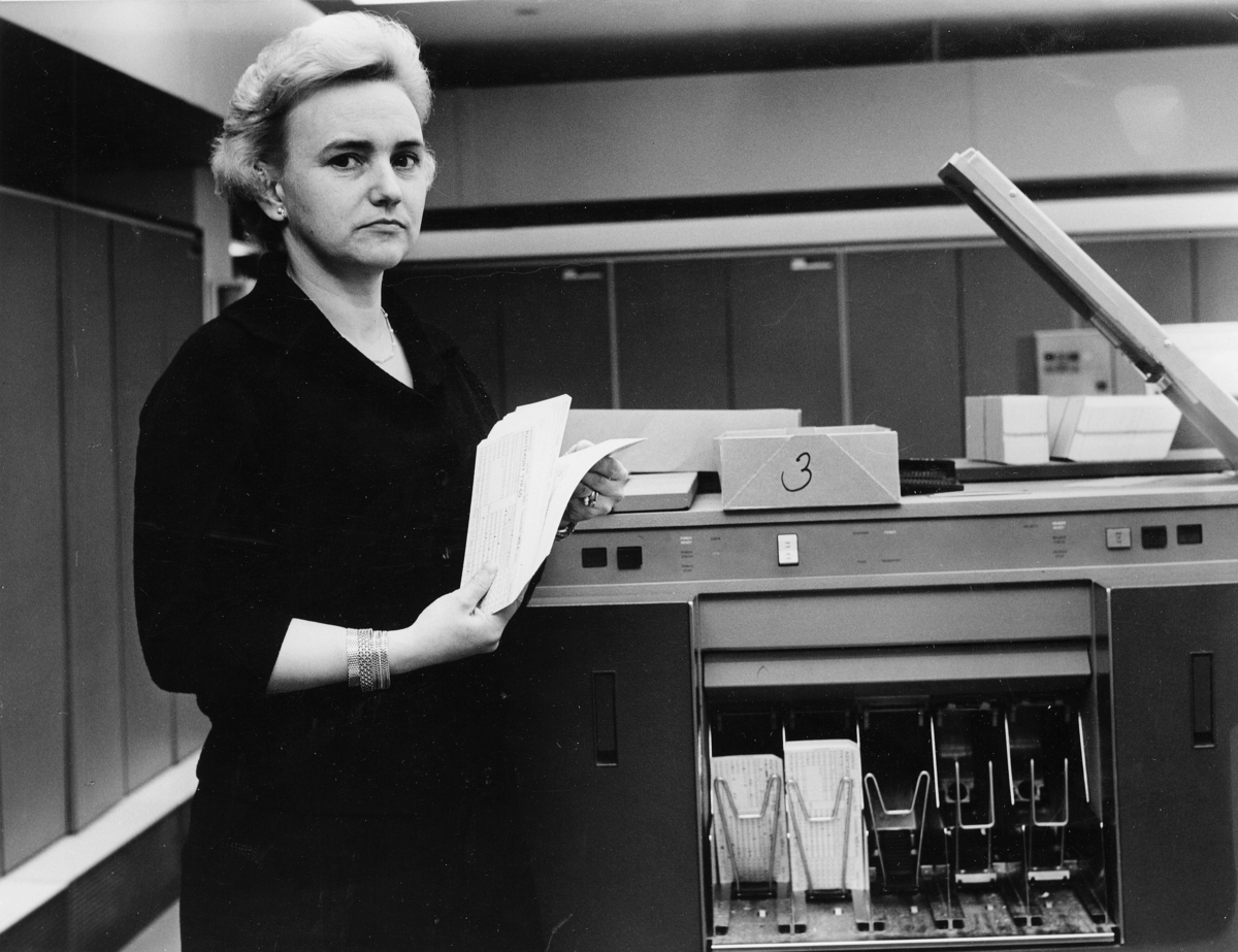 Fru Margit Lundberg sköter bl a en datamaskin som används för att få fram räntebesked till motbokskonton och som stansar 500 hålkort på två minuter.