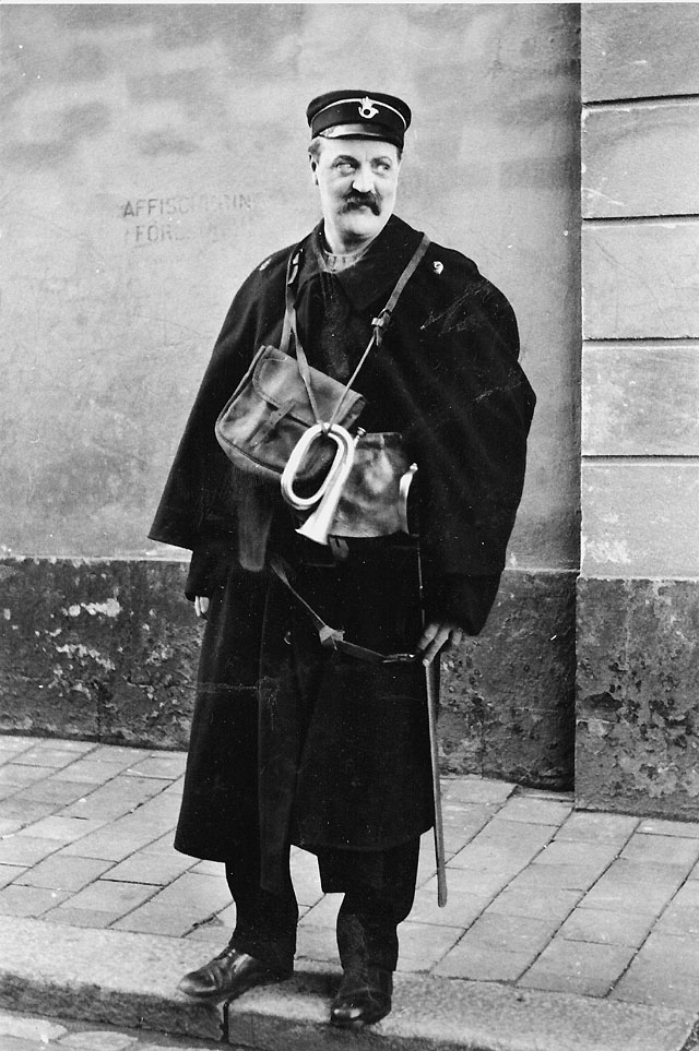 Brevbärarförman Gösta Larsson, Stockholm 12, i uniform för landsvägspostiljon, slutet av 1800-talet.
