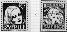 Tävlingsförslag till nya frimärken (svenska). Tävling arrangerad av Svenska Dagbladet 1934. Två förslag med Greta Garbo, Valörer 5 öre, resp. 1 krona.
