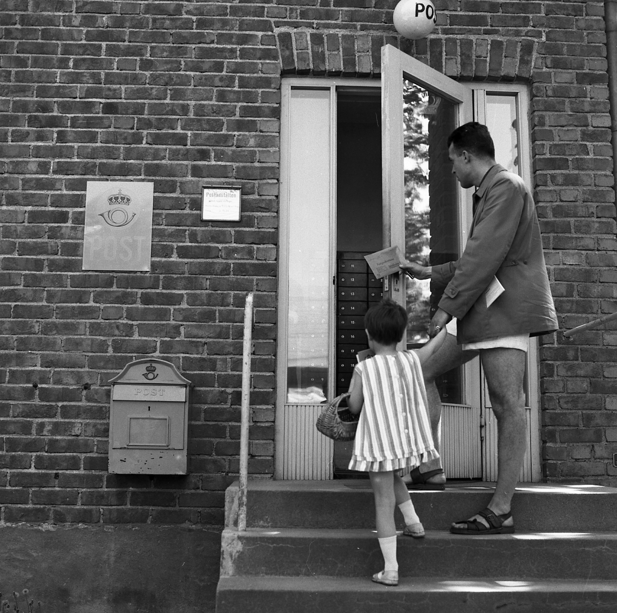 Sommargäst med dotter på väg in till postexpeditionen i Dalarö, 1961 med ett postgirokuvert. Bilden är arrangerad.