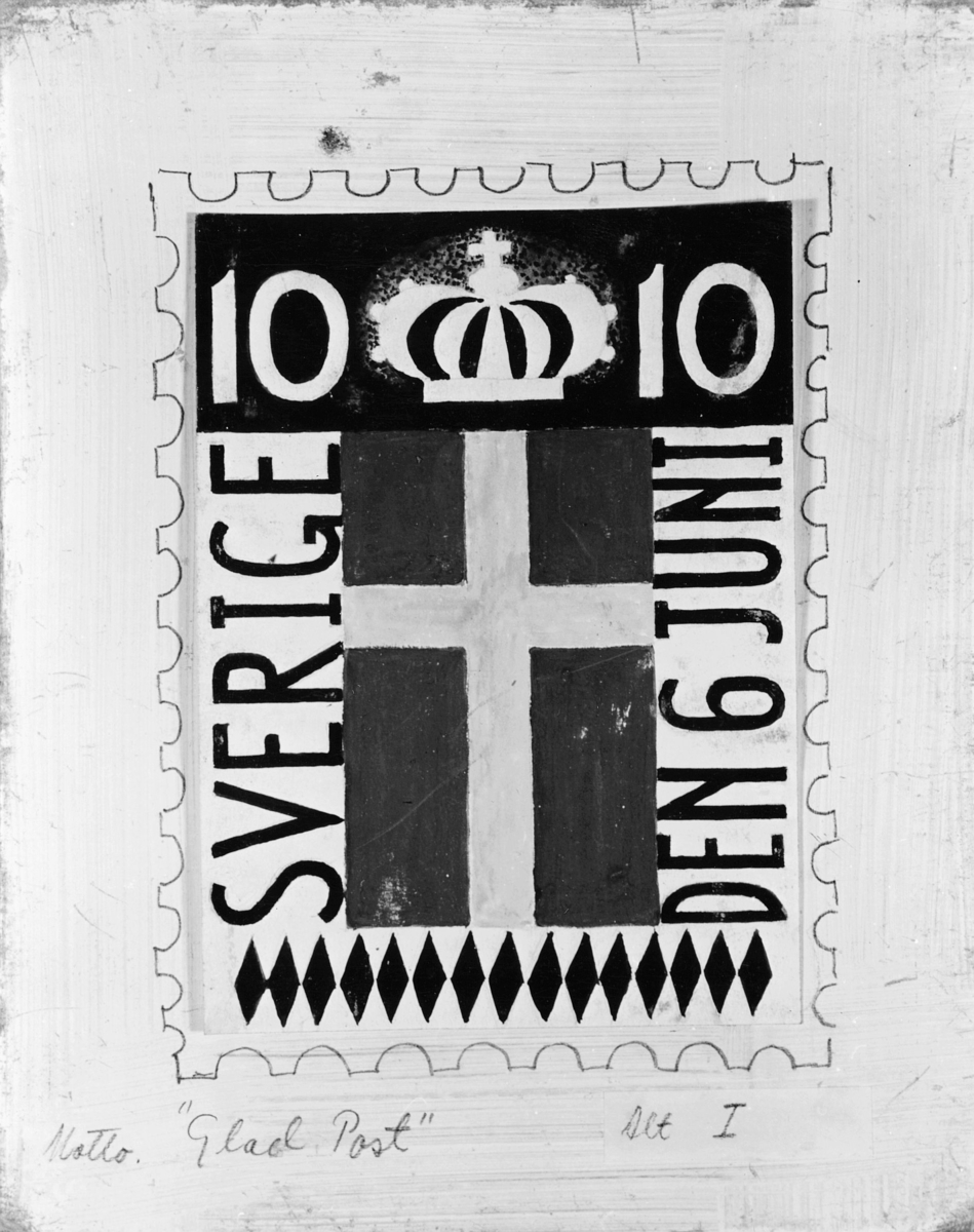 Originalteckning till frimärket "Svenska flaggans dag", 1955. Frimärket är utgivet till 50-årsminnet av den nya flaggan med ljusare färger och utan unionsmärke. Konstnär: Olle Olsson. Foton 27/2 1956.