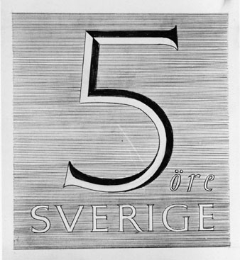 Förslagsskisser till frimärke Ny Siffertyp 1951-1965, utgivet 29/11 1951. Konstnär: Karl-Erik Forsberg. Blyerts. Valör 5 öre, texten "Sverige" nedtill.