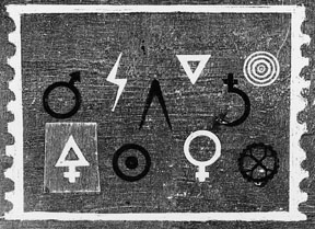 Frimärksförlaga till frimärket Ingenjörskonst och Industri, utgivet 27/5 1963. Övre raden från vänster: symboler för järn, elindustri, arkitektur, vattenkraft, bly, skogsindustri. Nedre raden: Svavel, guld, koppar, verkstadsindustri.