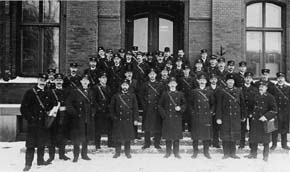 Postkontoret Stockholm 4. Brevbärarkåren uppställd på Södra Latins trappa. Under jullovet flyttade brevbärarexpeditionen till