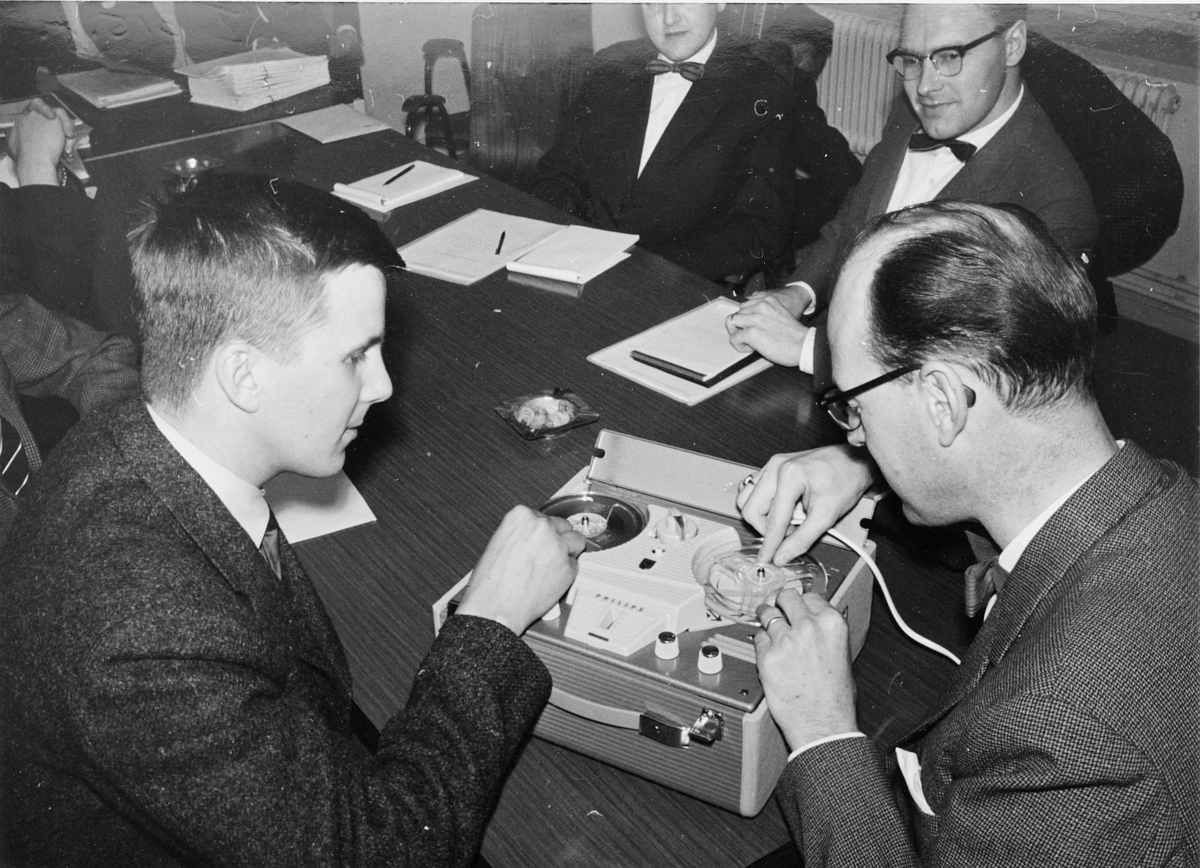 bandspelaren. Birger Sjöberg och Göran Torén tittar på.