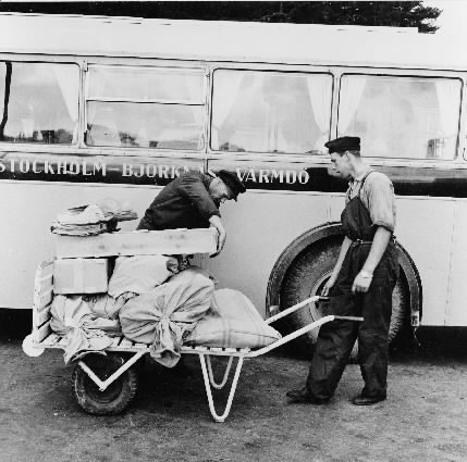 Post- och mjölktransportörerna, fiskarna Nils-Magnus Westerman (t.h.) och Roland Jansson hämtar möjaposten vid Björknäs-Värmdöbussen i Stavsnäs.