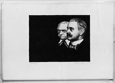 Frimärksförlaga till frimärket "Nobelpristagarna 1902", utgivet 10/12 1962. Originalteckningar utförda av Stig Åsberg (1909 - ). (I Postmusei samlingar). Nobelpristagarna Mommsen och Ross. Blyerts. 23,8 x 34,8 (14,4, x 19)