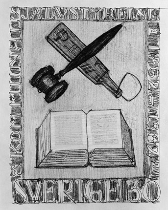 Frimärksförlaga till frimärket "Kommunallagarna 100 år", utgivet 21/3 1962. Budkavle, lagbok, ordförandeklubba. Förslagsteckningar utförda av Kerstin Abram-Nilsson. (I Postmusei samlingar). Förslag (6). Valör 30 öre.
