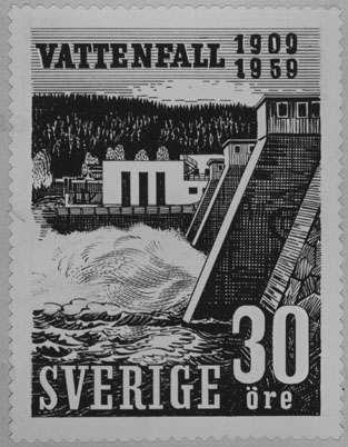Förslagsritningar - ej antagna - till frimärket Vattenfall 50 år, utgivet 20/1 1959. Kraftstationen vid Nämforsen i Ångermanland. Konstnär: Tor Hörlin. Förslag.
