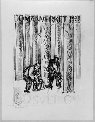 Förslagsteckningar - skisser - till frimärket Domänverket 100 år, utgivet 4/9 1959. Konstnär: Sven Ljungberg. Förslag "No 10".