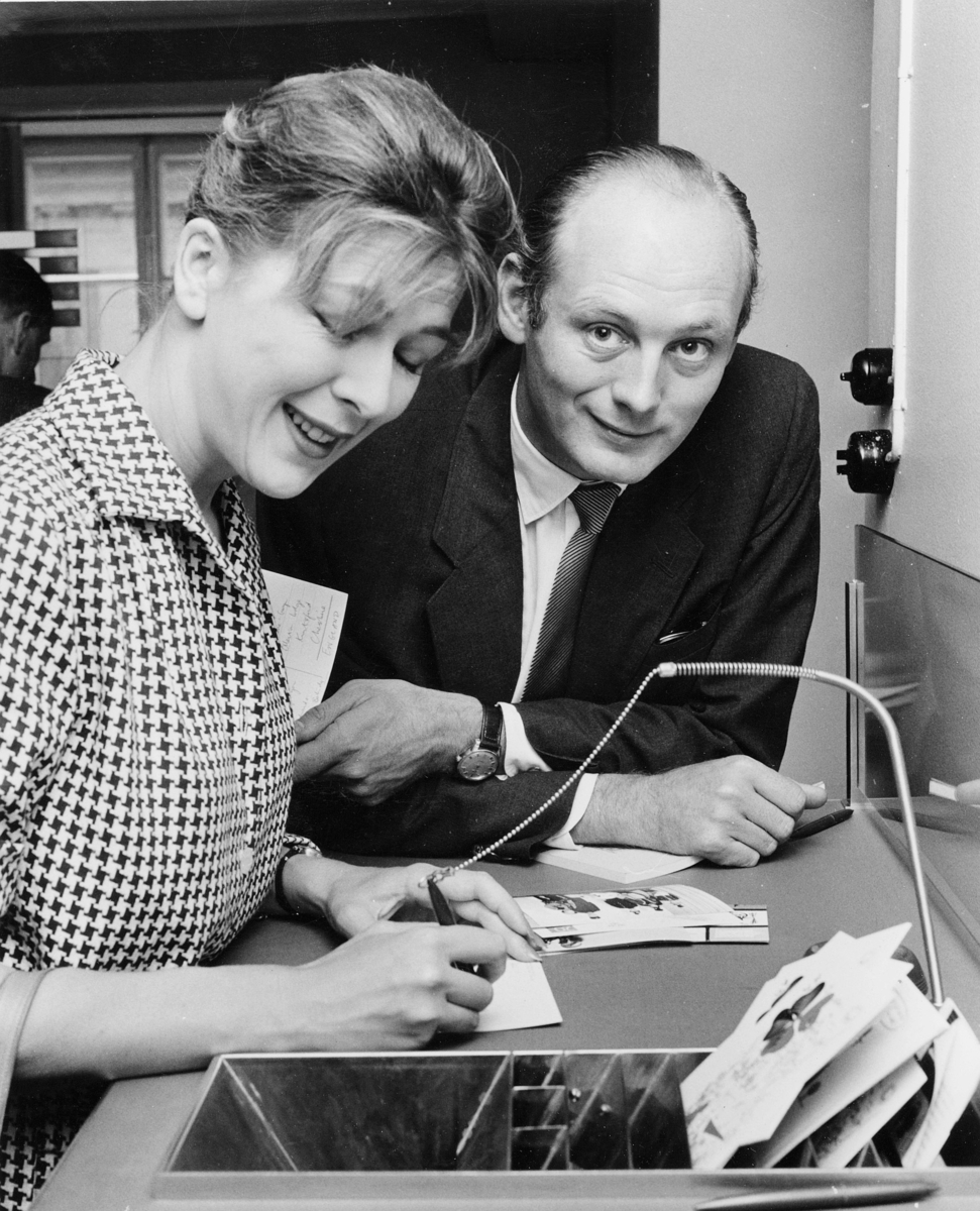 hans maka skriver brev efter att ha inhandlat frimärken i moderna