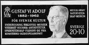 Frimärksförlaga till frimärket Gustaf VI Adolfs 80 år, utgivet 10/11 1962. Gustaf VI Adolf (1882 - 1973). Textförslag utförda av Erik Linné (1905 - ). (I Postmusei samlingar). Fotomontage och tusch. 20,4 x 42 (15,7 x 41,5). Valörer 20 + 10 öre.