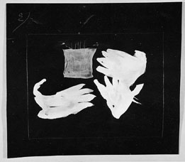Frimärksförlaga till frimärket Världskampanjen mot hunger, utgivet 21/3 1963. Med anledning av FN-kampanjen mot hungern. Motivet är tre stycken sädesax samt stiliserade händer. Originalteckning och förslagsskisser utförda av Vera Nilsson.