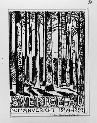 Förslagsteckningar - skisser - till frimärket Domänverket 100 år, utgivet 4/9 1959. Konstnär Sven Ljungberg. Förslag nr "6" (på blad med fyra förslag). Valör 30 öre.