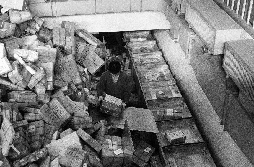 Foton 21/12 1962. Från grovsorteringen. Påläggning av paket på