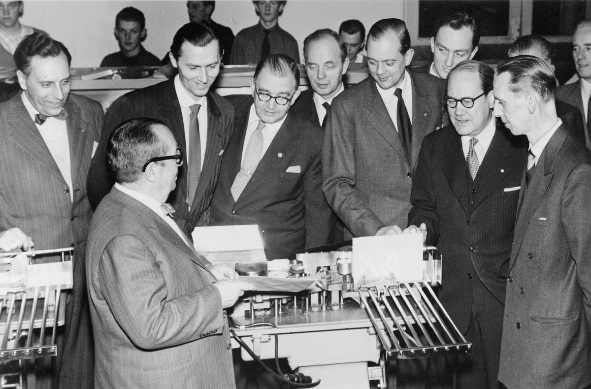 filatelister vid en stämpelmaskin på avgående avdelningen.