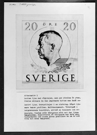 Bidrag till 1951 års tävling om ny frimärkstyp med Gustaf VI Adolfs porträtt. Konstnär: Mark Sylwan, med motto: "I stålgravyr". Alternativ 1. Blyerts på fotogrund.