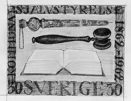 Frimärksförlaga till frimärket "Kommunallagarna 100 år", utgivet 21/3 1962. Budkavle, lagbok, ordförandeklubba. Förslagsteckningar utförda av Kerstin Abram-Nilsson. (I Postmusei samlingar). Förslag (2).