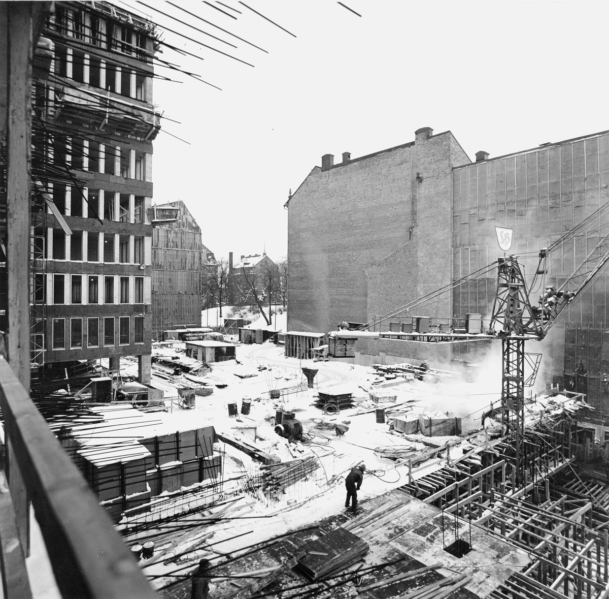 Postbankshusets gård, sedd från Rådmansgatan. I fonden skymtar Tegnérlunden. I förgrunden pågår arbetena med bottenvåningen i Rådmansgatan. I huset skall inrymmas postverkets läkarcentral.
