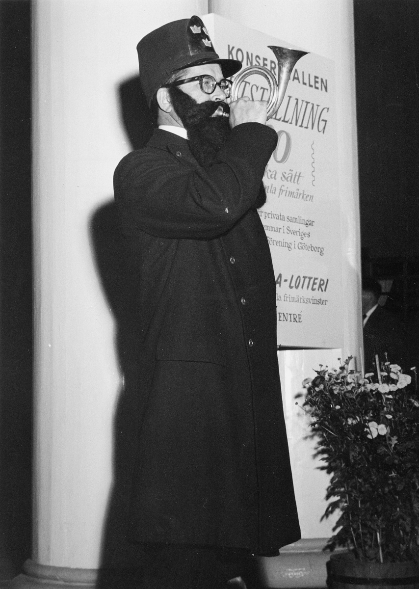 Folke Edvall, i uniform från Postmuseum, blåser in