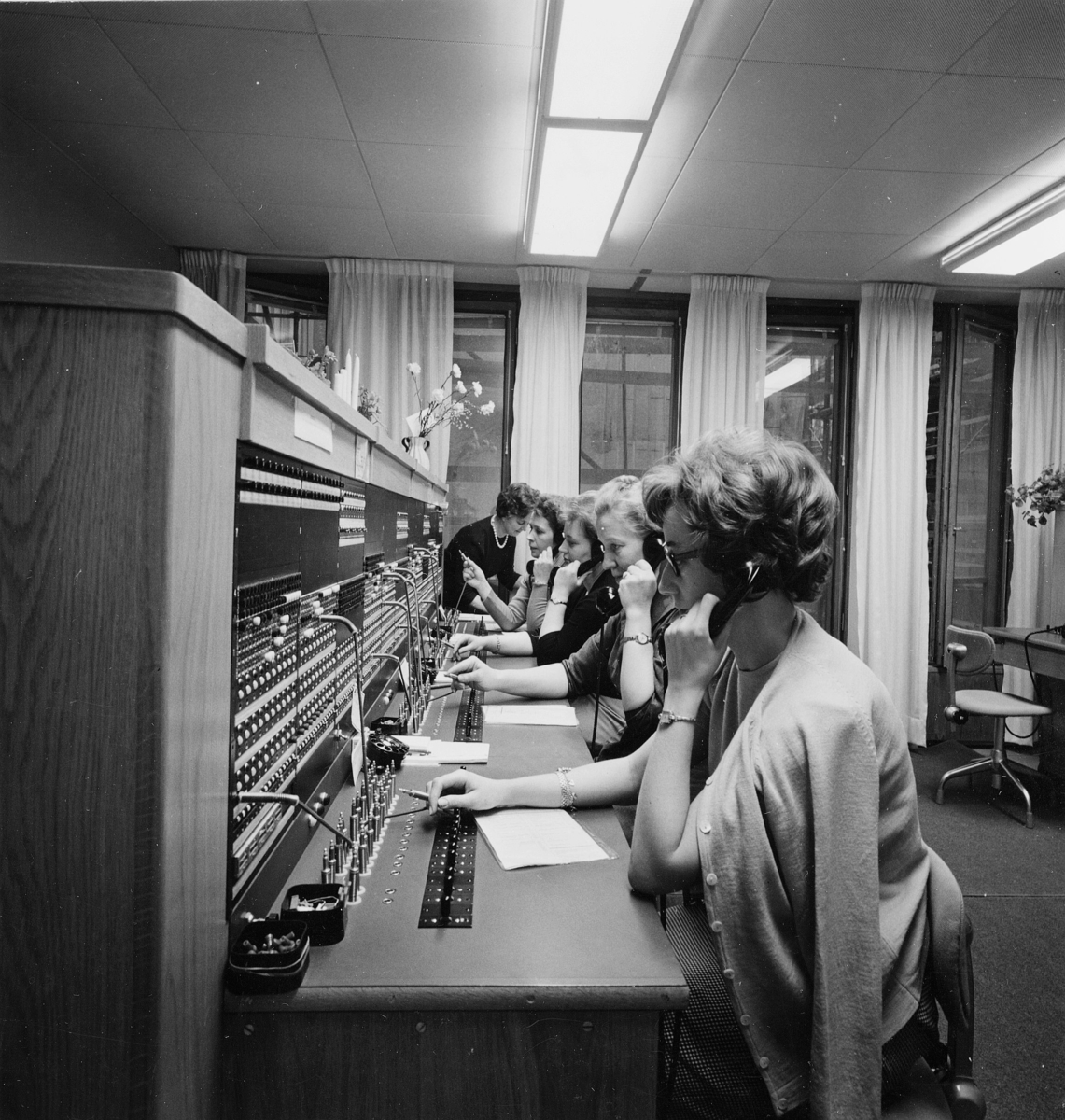 Postbankens telefonväxel i våningen 3 trappor. Telefonisterna vid sina manöverbord. Fönster åt gården.