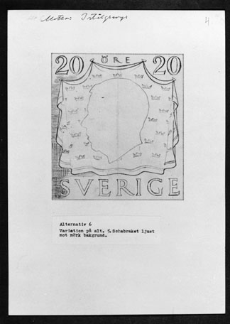 Bidrag till 1951 års tävling om ny frimärkstyp med Gustaf VI Adolfs porträtt. Konstnär: Mark Sylwan, med motto: "I stålgravyr". Alternativ 6. Blyerts. Valör 20 öre.