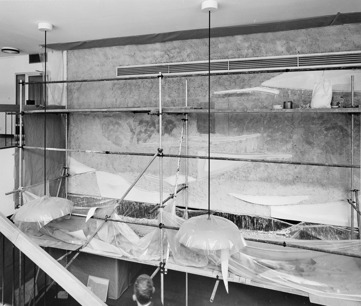 Väggreliefen sedd från trappan till hallens övre plan (som skymtar t.v.)