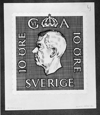 Bidrag till 1951 års tävling om ny frimärkstyp med Gustaf VI Adolfs porträtt. Konstnär: Harry Kumlien. Motto: "Märk väl".