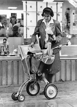nr 1/1964). Fru Kira Gustafsson har hjälp av brevbäringsvagn när hon