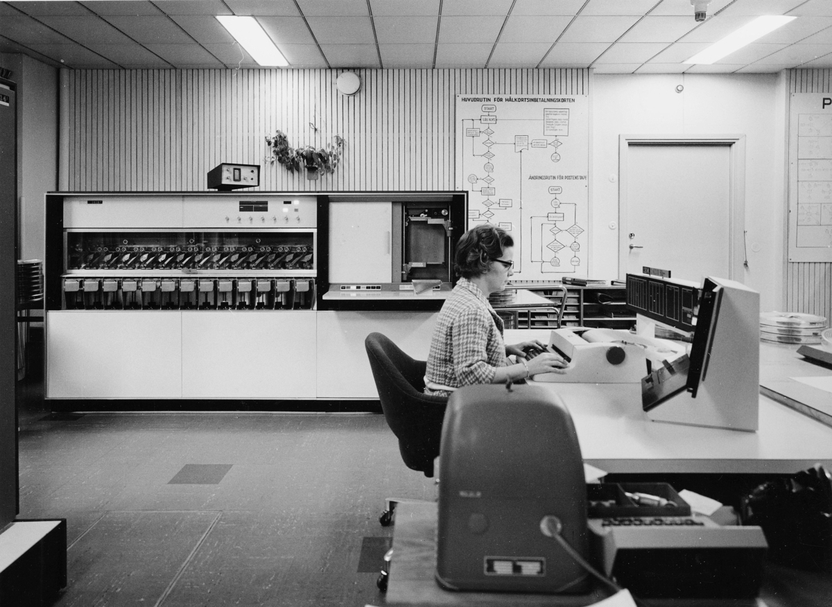 I fonden t.v. den optiska läsaren IBM 1418 Optical Caracter Reader.