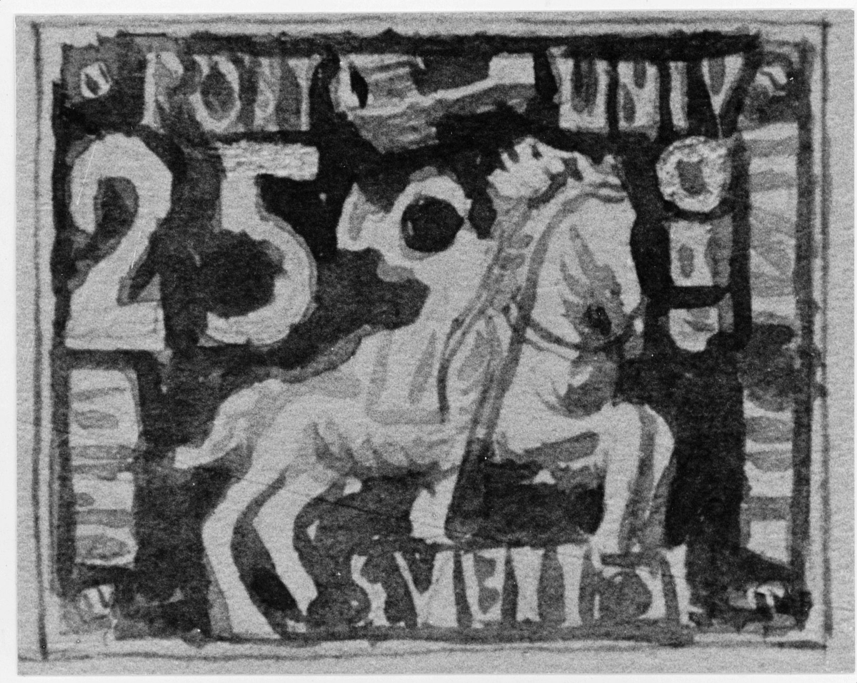 Frimärksförslag till frimärket "Världspostföreningens 50-årsjubileum, 1924". Förslagsteckning nr 2, akvarell av Ture Tideblad. (Ingick i 1922 års tävlan). Foto 2/10 1961.