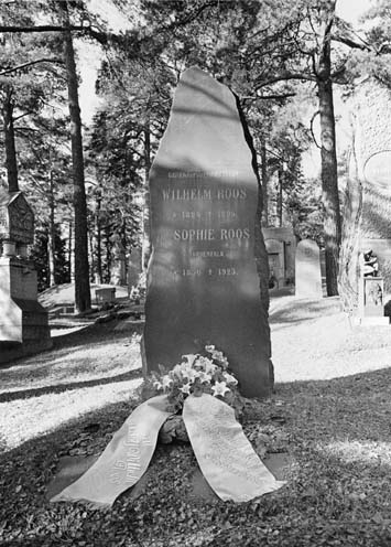 Generalpostdirektör Wilhelm Roos gravsten på Norra Kyrkogården i Stockholm. En krans från postsparbanken är nedlagd med anledning av Postsparbankens 75 års jubileum, 1959.