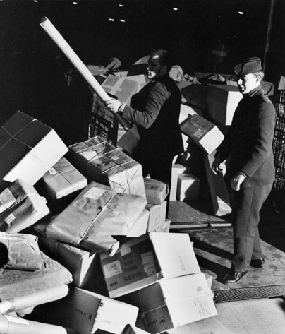 Illustration till bildserie om rätt och felaktigt sätt att behandla postpaket. Ankommande paket från Stockholmsfilialerna lossas vid transportavdelningen, Stockholm Ban. Lösgående paket lossas för sig, kastas ej.