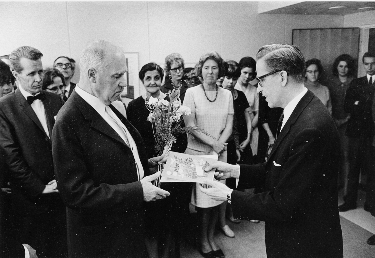 Reklamationskontor, avgår med pension och uppvaktas av Kommersiella byråns personal.Öktr Georg Sjöblom, postdirektionen i Sth D, lämnar en gåva.