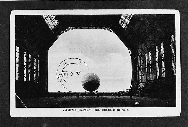 Bildsidan. "Bodensee" tas in i en hangar. Ankomststämpel "Järrestad