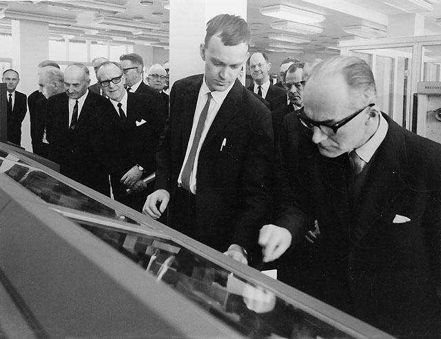 Titel: Civ.ing. Erland Persson (2:e från höger) demonstrerar för en av delegaterna hur läsaren fungerar.