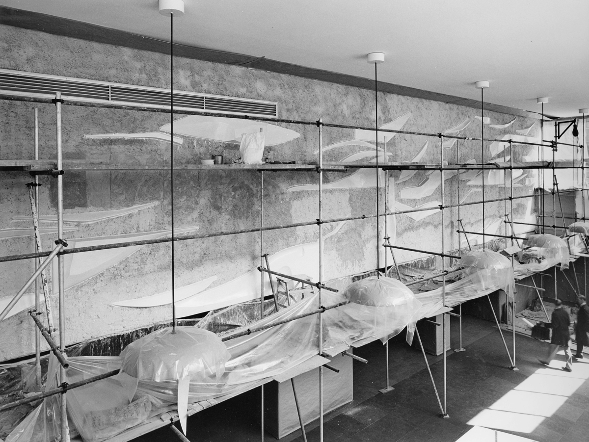 Väggreliefen sedd från trappan till hallens övre plan.