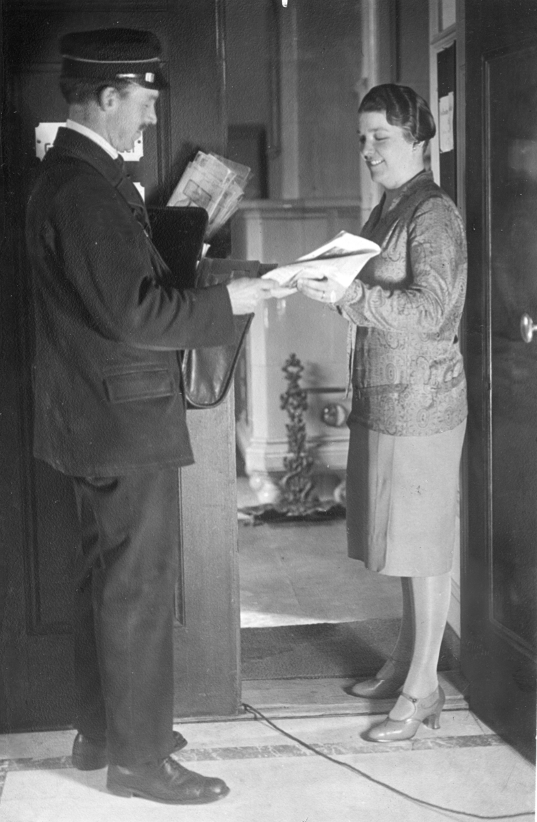 Brevbärare O.D. Andersson på postkontoret Stockholm 1, delar ut post till kund i 10:e distriktet, 1935.