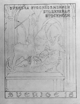 Frimärksförlaga till frimärket Byggnadsminnen, "Storkyrkan" i Stockholm, utgivet 25/10 1962. Interiör med skulpturen "S:t Göran och Draken". Skisser utförda av Waldemar Bernhard. (I Postmusei samlingar). Foton 2/10 1962. Skiss II.