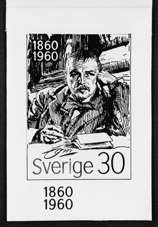 Frimärksförlaga till frimärket Anders Zorn, utgivet 18/2 1960. Anders Zorn (1860 - 1920). Textkomposition av frimärksgravören Arne Wallhorn. Ej realiserat förslag till textkomposition, tusch och vit täckfärg. Valör 30 öre.