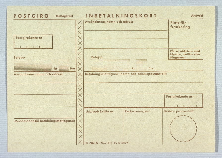 Seriebild M 41. Ej ifyllt postgiroinbetalningskort. Blankett 703 A
