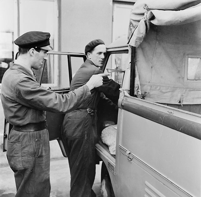 Chaufför Einar Andersson, t.v., får hjälp av montör Eric Carlsson