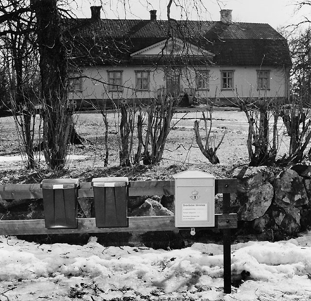 Två moderna postlådor av plast och brevlåda på nyuppsatt ställ.