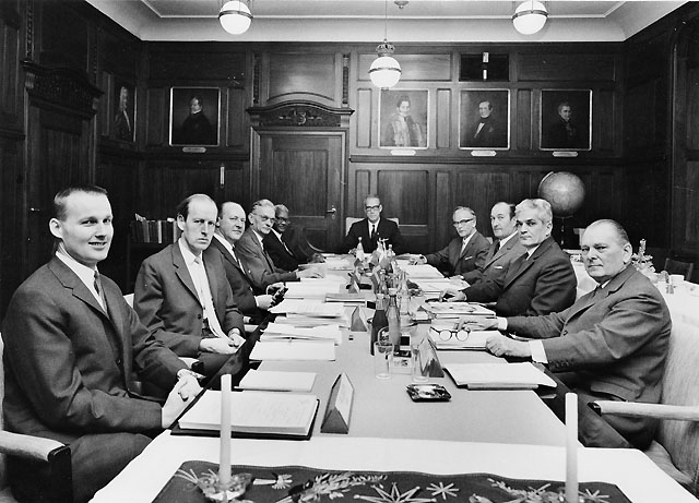 Runt bordet syns fr v Torsten Zillén, KU, Olof Bergling, MT, bd