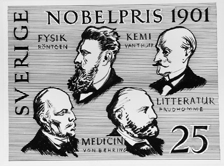 Frimärksförlaga till frimärket Nobelpriset 1901, utgivet 9/12. WC Röntgen (1845 - 1923) i fysik, RFA Sully- Prudhomme (1839 - 1907) i litteratur, EA von Behring (1854 - 1917) i medicin, JH vant Hoff (1852 - 1911). Förslagsteckningar. (I Postmusei samlingar). Ej antaget förslag utfört av Mark Sylwan. Valör 25 öre.