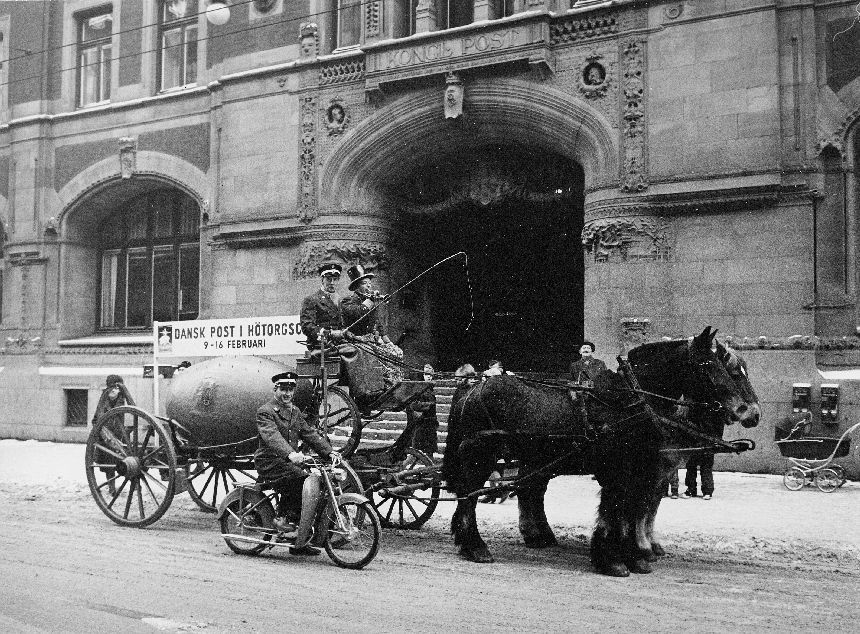Med kuglepostvagnen, danska postverkets jubileumsgåva till svenska postverkets 300-årsdag 1936, kördes posten mellan Hötorgscity och postkontoret Stockholm 1. Per Dahlberg, från postverkets frimärkstryckeri, fungerade som posthornsblåsande postiljon. Danska postbudet Ib Isaksson medföljde per moped.