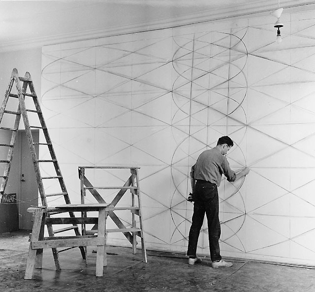Blivande U.P.U.-rummet på 2 trappor (f.d. rum 4). Konstnären Lennart Rodhe skisserar upp sin väggmålning "Paket på löpande band", vars original tillhör postkontoret i Östersund. Foto 2 juni 1955.