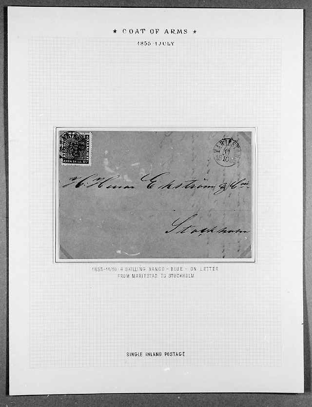 Brev från Mariestad till Stockholm frankerat med frimärke: vapentyp skilling banco (utg. 1/7 1855).