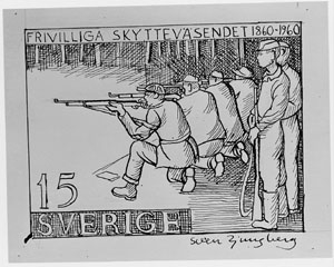 Frimärksförslag - skissförslag - till frimärket Frivilliga Skytteväsendets 100-årsjubileum, utgivet 30/6 1960, av konstnär Sven Ljungberg. (I Postmusei samlingar).